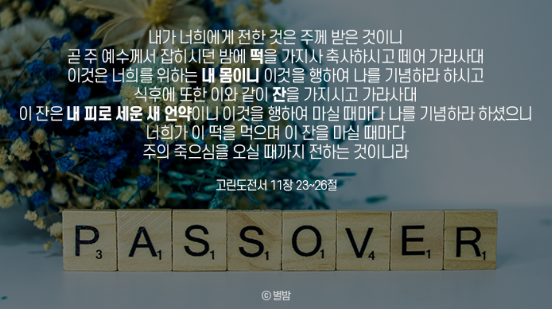 눅22:13~20 저희가 나가 그 하시던 말씀대로 만나 유월절을 예비하니라... 내가 고난을 받기 전에 너희와 함께 이 유월절을 먹기를 원하고 원하였노라... 떡을 가져 사례하시고 떼어 저희에게 주시며 가라사대 이것은 너희를 위하여 주는 내 몸이라.... 잔도 이와 같이 하여 가라사대 이 잔은 내 피로 세우는 새 언약이니 곧 너희를 위하여 붓는 것이라
