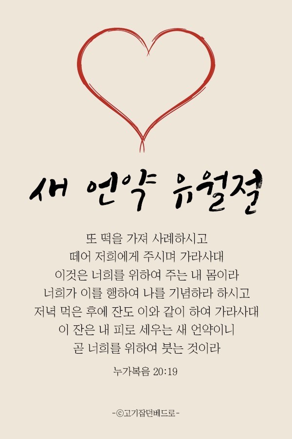 저녁먹은 후에 잔도 이와 같이 하여 가라사대 이 잔은 내 피로 세우는 새 언약이니 곧 너희를 위하여 붓는 것이라